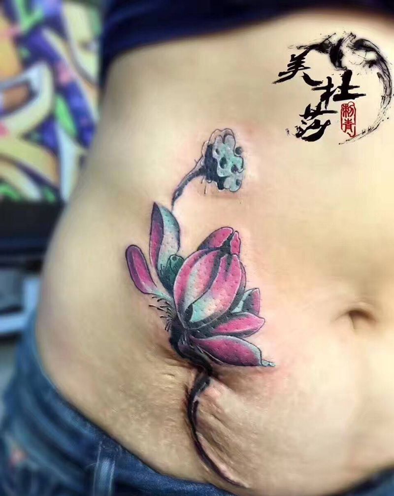 当前位置: 首页 >甘肃省兰州市纹身店-兰州美杜莎刺青纹身图案>疤痕莲花遮盖。纹身图片_成品腹部传统植物纹身图案