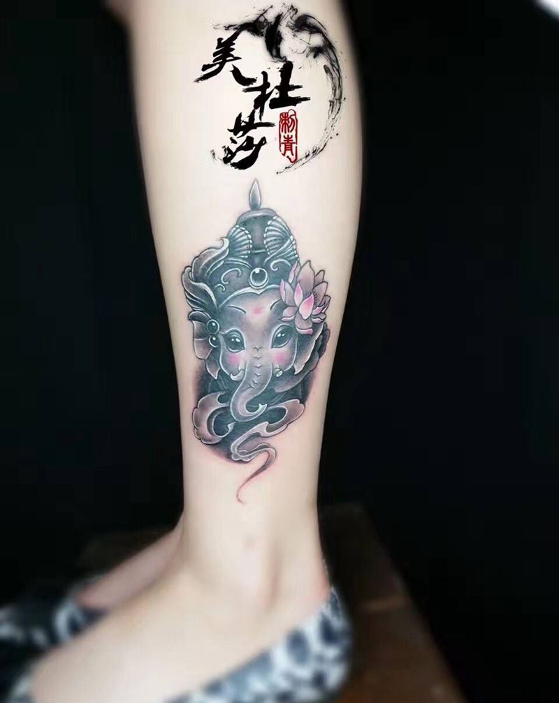 小象。纹身图片_成品腿部清新传统动物鬼神纹身图案