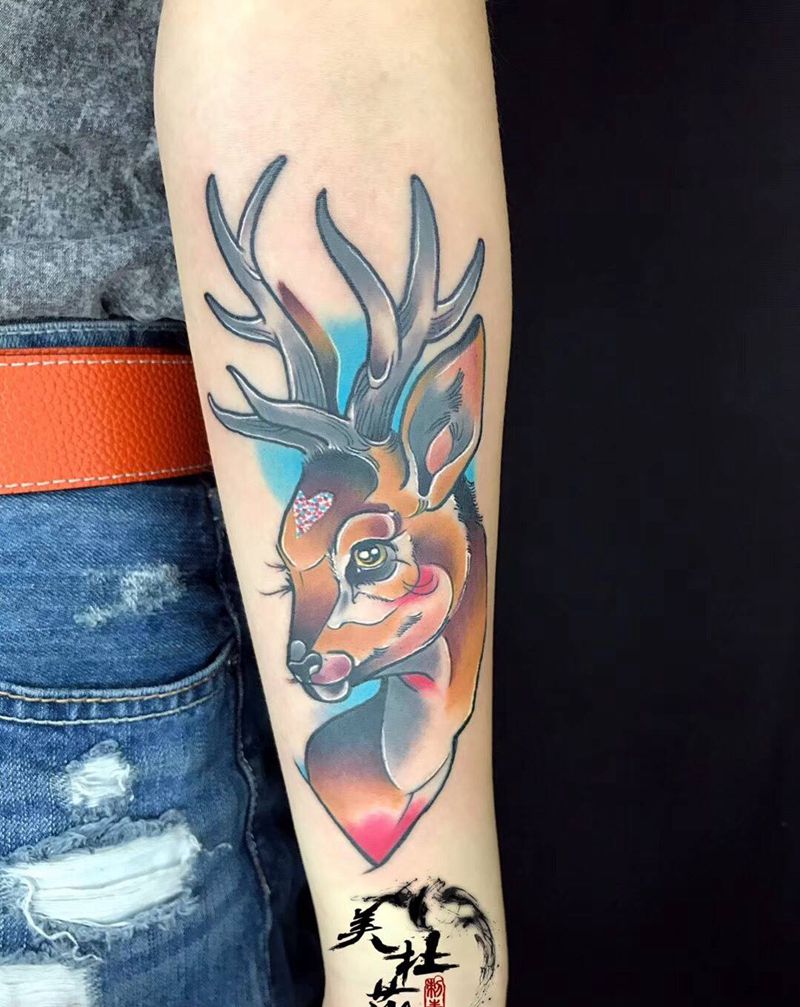 鹿。纹身图片_成品手臂欧美动物原创纹身图案