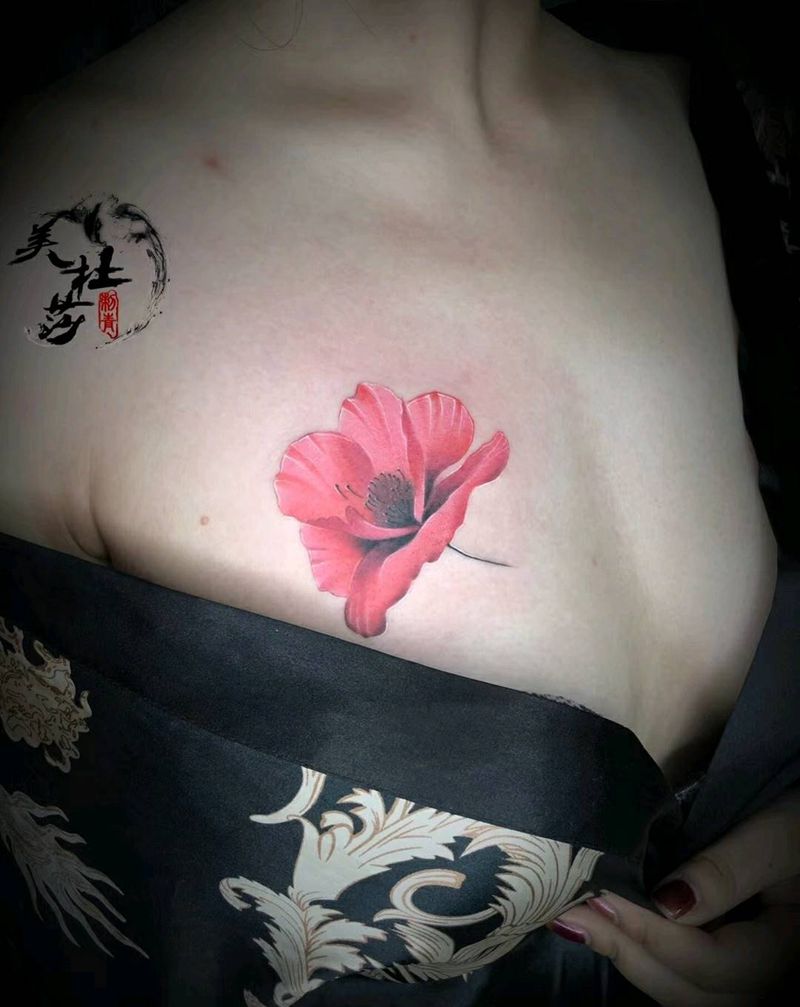 罂粟花纹身图片_胸部清新植物成品纹身图案