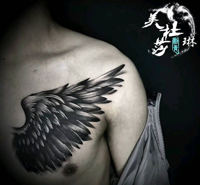 翅膀 遮盖纹身图片_胸部欧美写实遮盖纹身图案