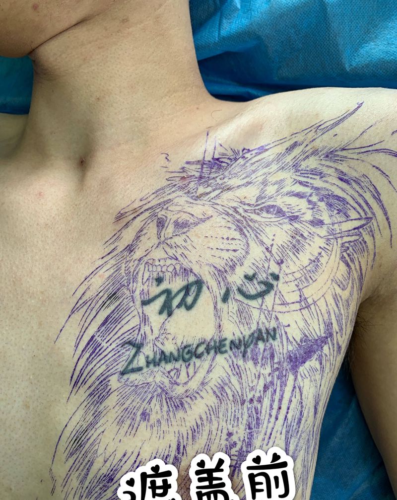 狮子遮盖纹身图片_胸部针痕纹身图案