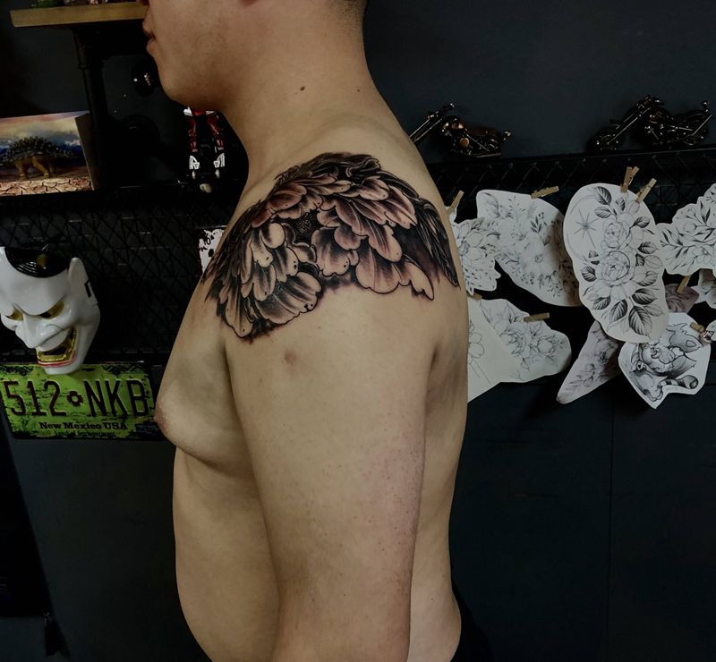 黑灰 牡丹纹身图片_肩部新传统纹身图案