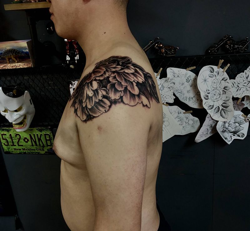 黑灰 牡丹纹身图片_肩部新传统纹身图案