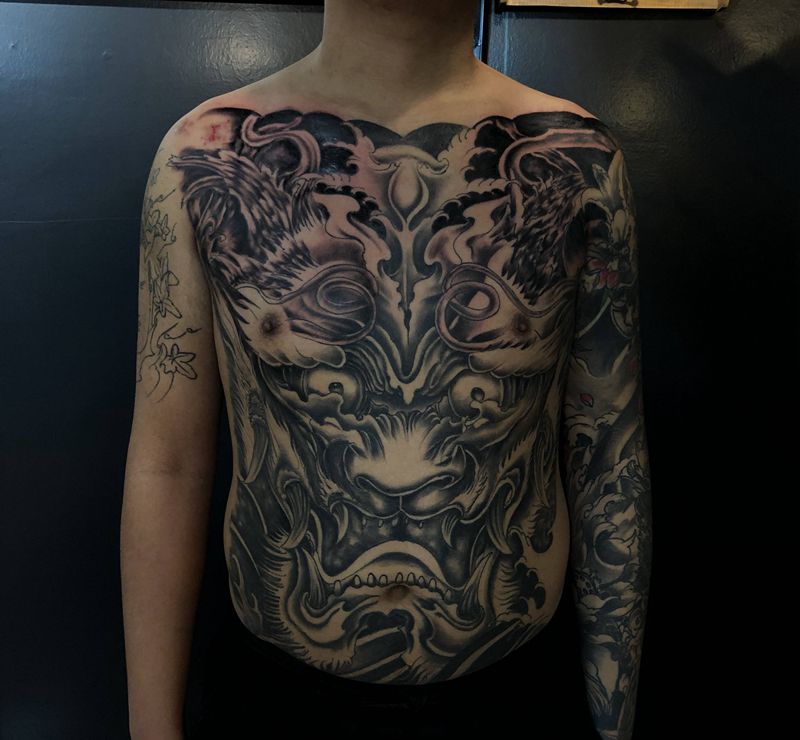 当前位置: 首页 >甘肃省白银市纹身店-明刺先生 艺术刺青纹身图案>店内前胸黑灰完成彩色~纹身图片_腹部胸部新传统纹身图案