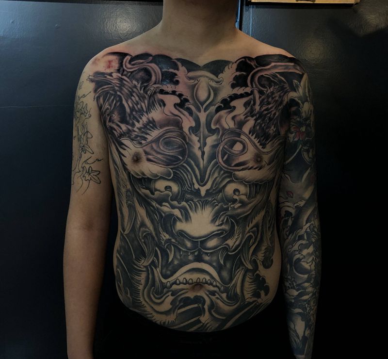 当前位置: 首页 >甘肃省白银市纹身店-明刺先生 艺术刺青纹身图案>店内前胸黑灰完成彩色~纹身图片_腹部胸部新传统纹身图案