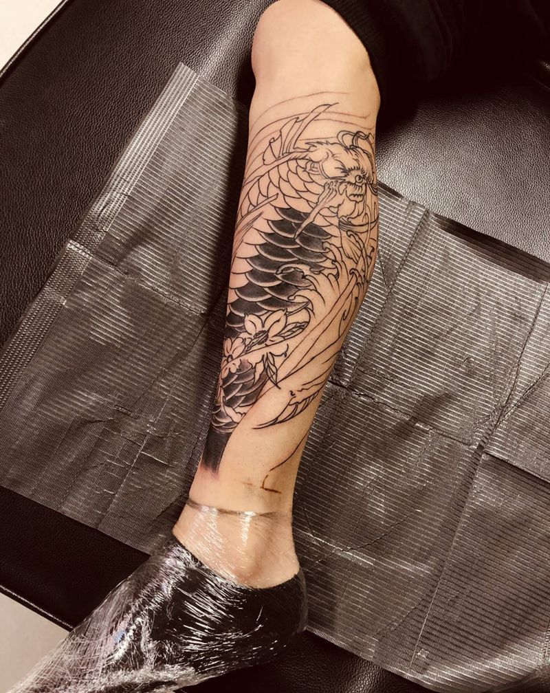 • T网红王老大花腿龙纹身图片_腿部新传统纹身图案