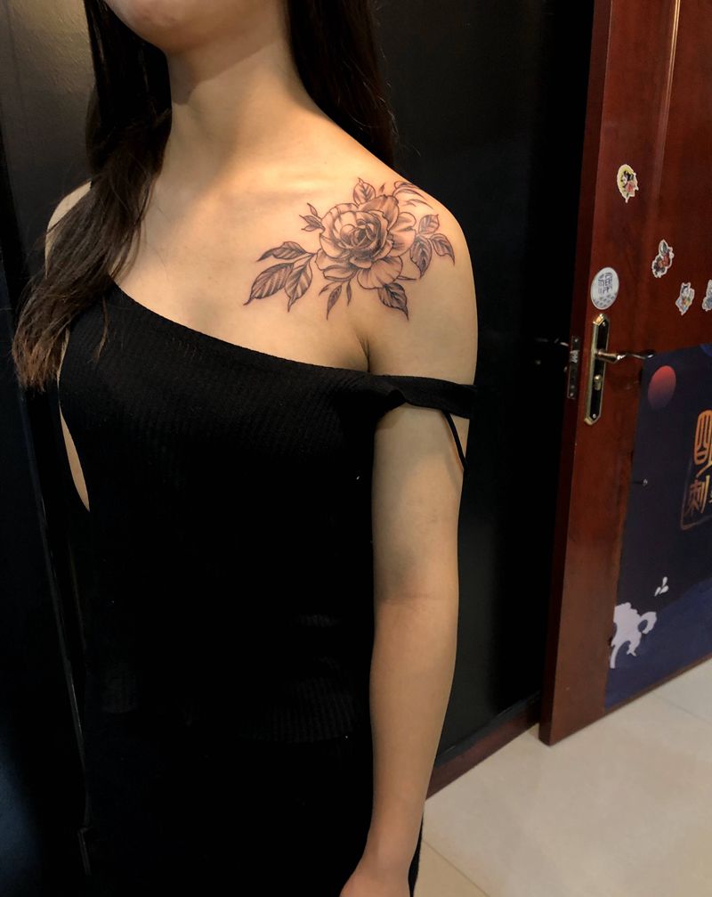 肩部素花纹身图片_肩部新传统点刺纹身图案
