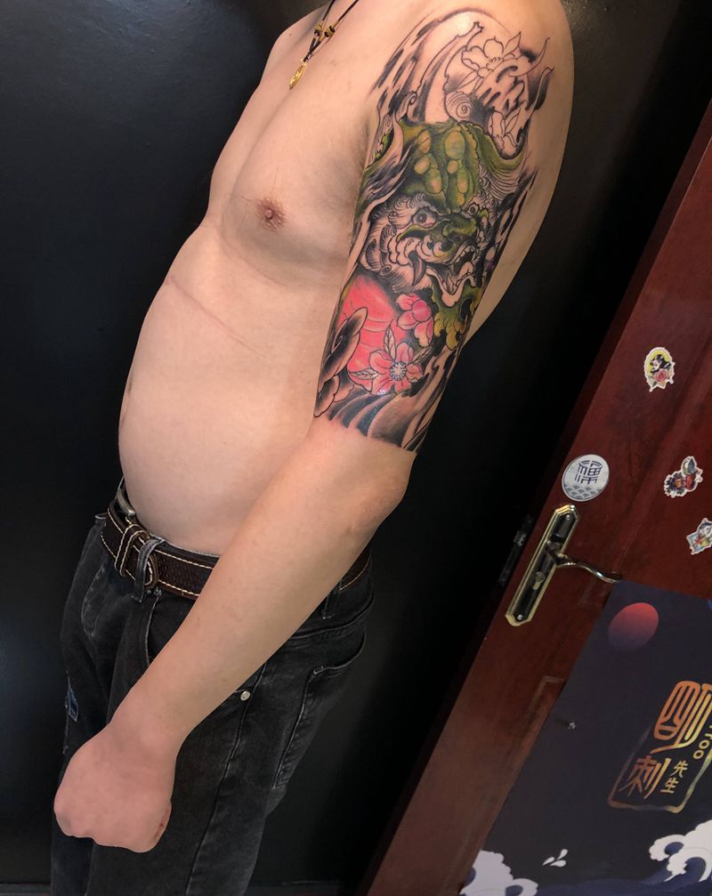 当前位置: 首页 >甘肃省白银市纹身店-明刺先生 艺术刺青纹身图案>唐狮遮盖纹身图片_手臂新传统纹身图案