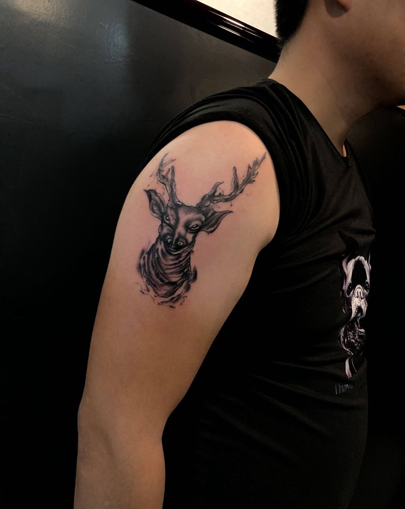 当前位置: 首页 >甘肃省白银市纹身店-明刺先生 艺术刺青纹身图案>鹿头纹身图片_手臂新传统纹身图案