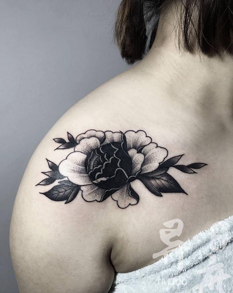 遮盖纹身图片_肩部老传统牡丹纹身图案