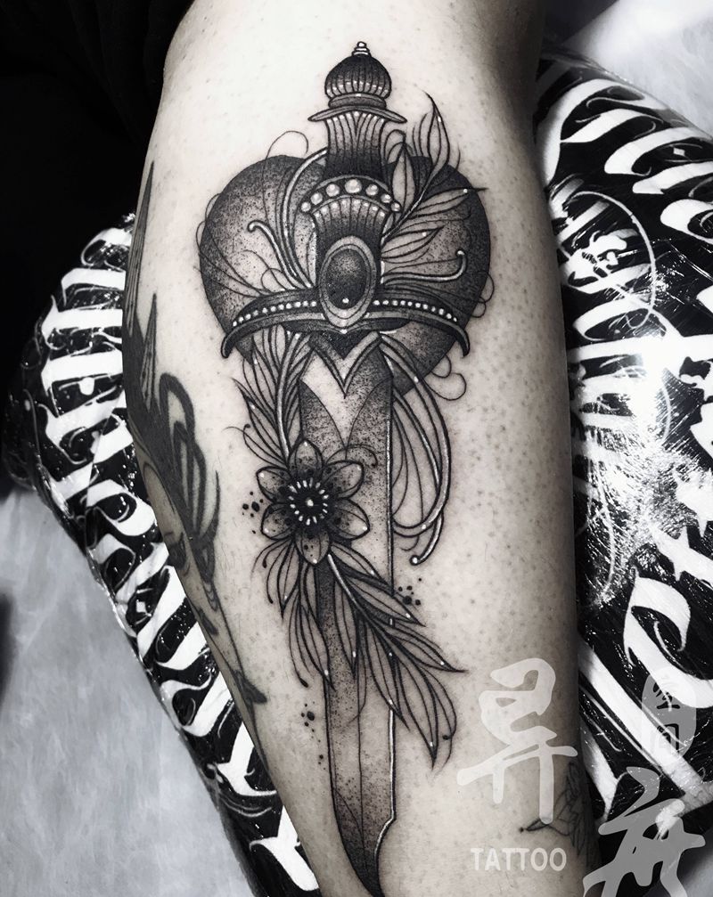 当前位置: 首页 >陕西省安康市纹身店-异度空间纹身馆纹身图案>点刺匕首纹身图片_腿部手臂点刺匕首素花点刺纹身图案