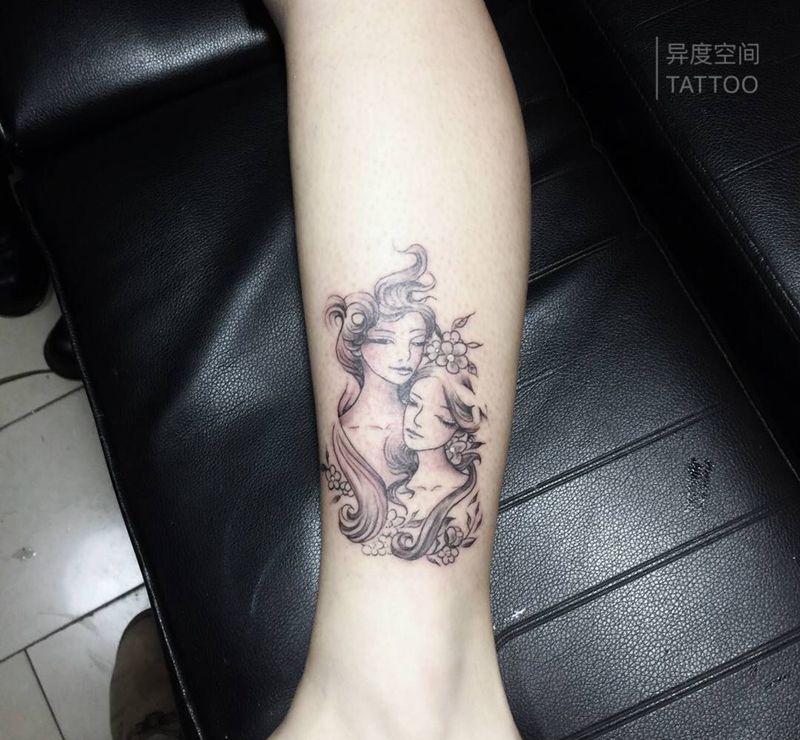 双子座纹身图片_腿部脚部星座双子座纹身图案