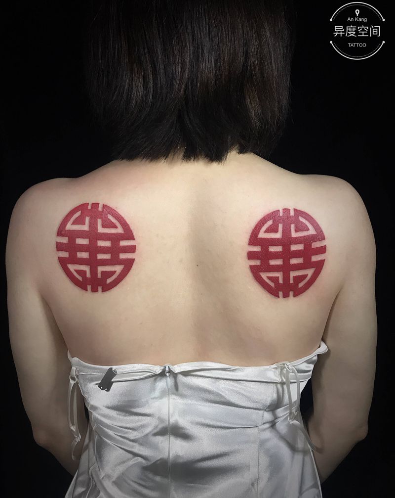 当前位置: 首页 >陕西省安康市纹身店-异度空间纹身馆纹身图案>红双喜纹身图片_背部肩部图腾喜喜纹身图案