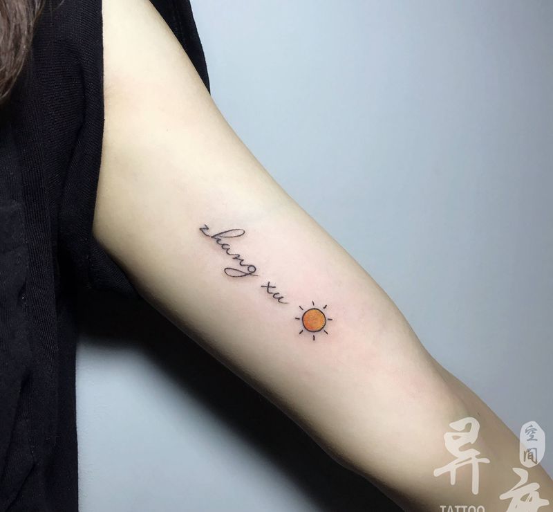 字母纹身图片_腿部手臂花体字太阳英文纹身图案