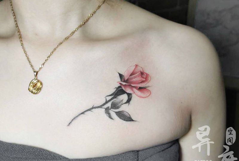 玫瑰纹身图片_胸部肩部水彩纹身图案