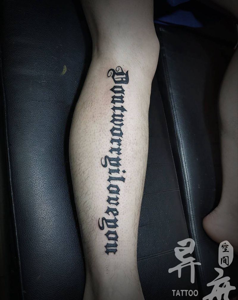 当前位置: 首页 >陕西省安康市纹身店-异度空间纹身馆纹身图案>哥特体纹身图片_腿部手臂花体字字母纹身图案