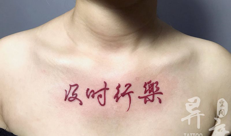 汉字纹身图片_胸部背部水墨花体字书法及时行乐毛笔字纹身图案