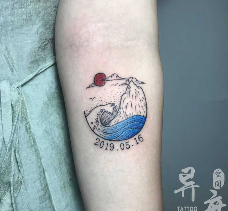 日出纹身图片_手臂腿部点刺海浪风景纹身图案