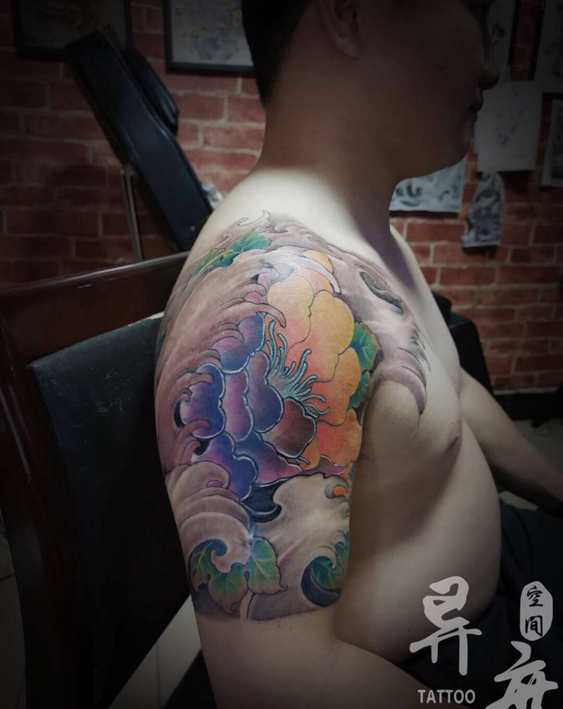 旧图遮盖纹身图片_手臂新传统牡丹纹身图案