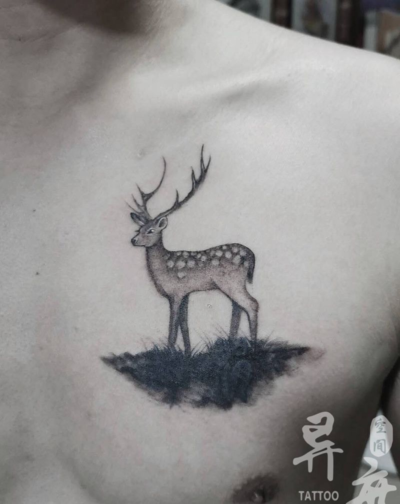 遮盖纹身图片_胸部点刺鹿纹身图案
