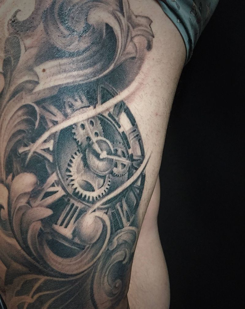 欧美时钟接老传统纹身图片_腿部纹身图案