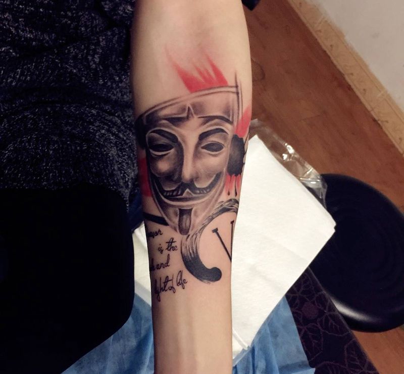 当前位置: 首页 >甘肃省兰州市纹身店-恒艺刺青-TATTOO纹身图案>V字仇杀队纹身图片
