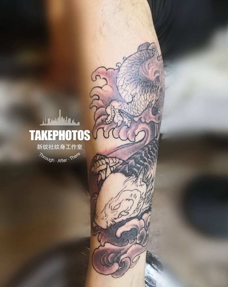 • T网红王老大花腿龙纹身图片_腿部新传统纹身图案