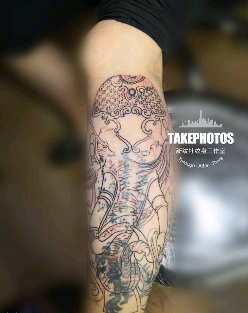 当前位置: 首页 >甘肃省兰州市纹身店-新纹社工作室纹身图案>象神遮盖纹身图片_腿部老传统新传统纹身图案