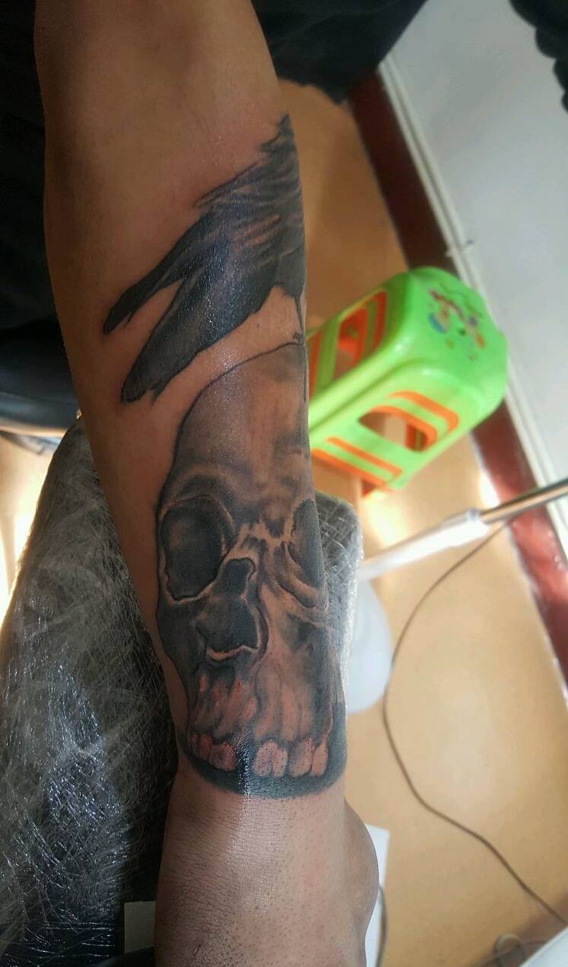 当前位置: 首页 >甘肃省兰州市纹身店-新纹社工作室纹身图案>乌鸦骷髅纹身图片