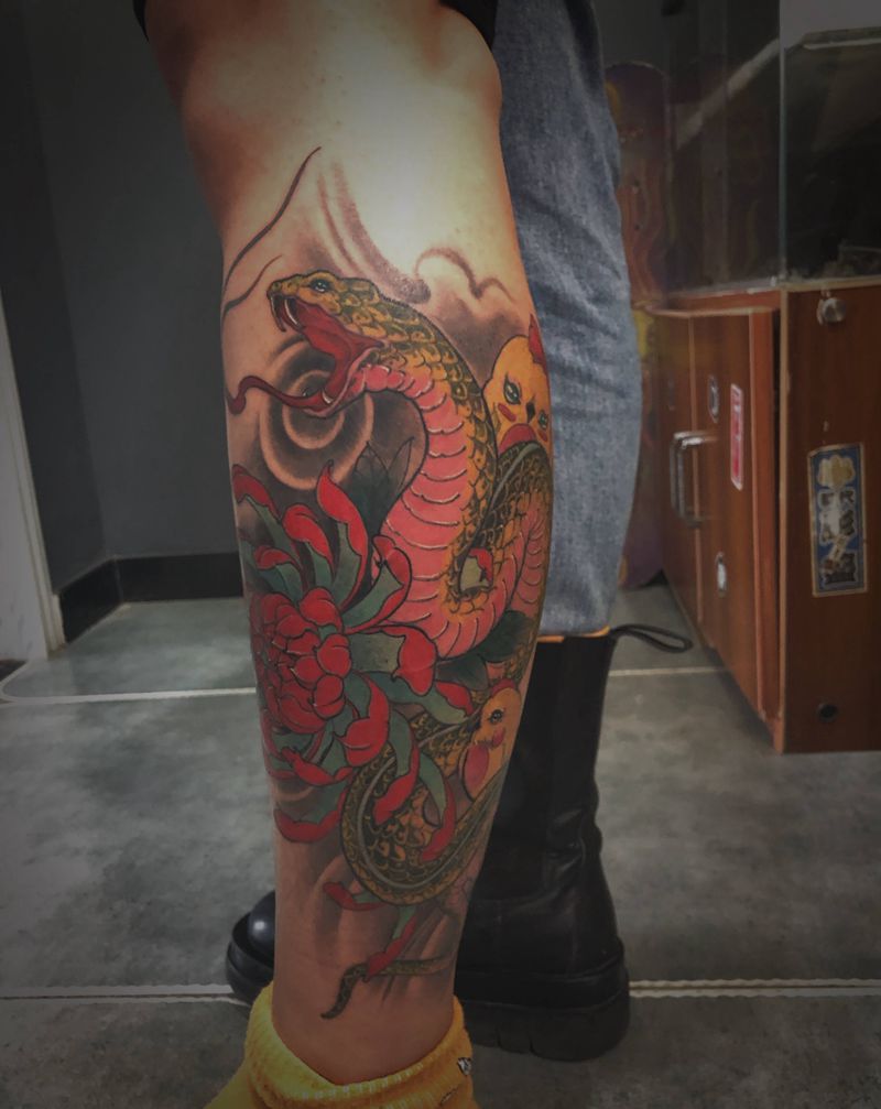 • T网红王老大花腿龙纹身图片_腿部新传统纹身图案