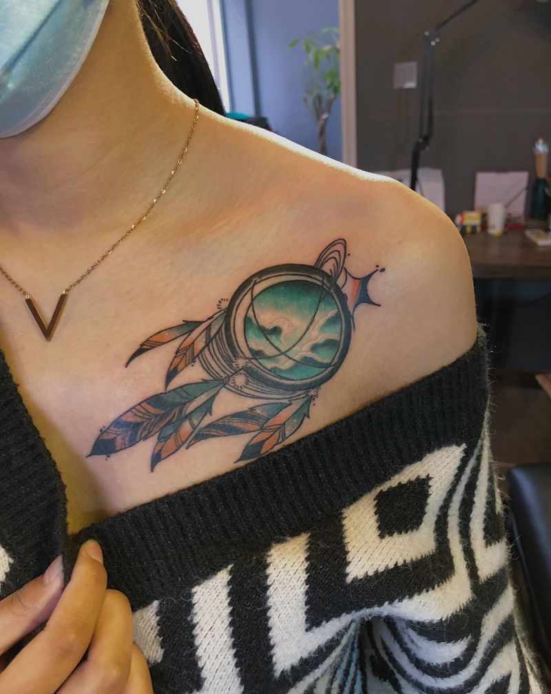 当前位置: 首页 >甘肃省天水市纹身店-天水新刺客纹身纹身图案>捕梦网纹身图片_胸部New School纹身图案