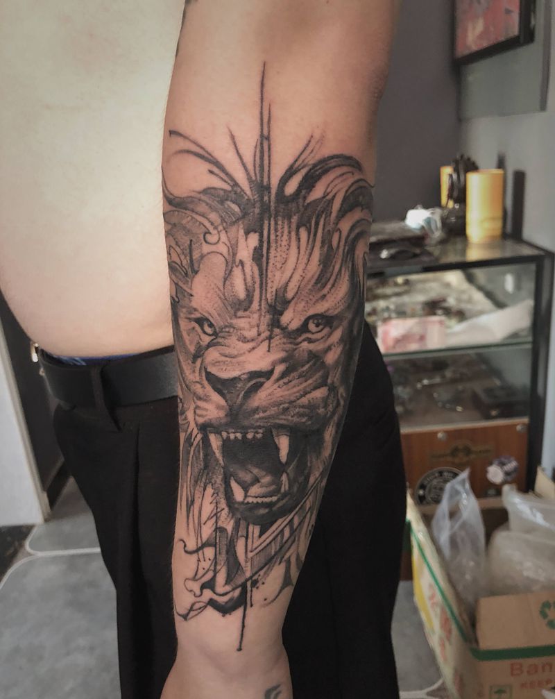 当前位置: 首页 >甘肃省天水市纹身店-天水新刺客纹身纹身图案>狮子纹身图片_手臂点刺纹身图案