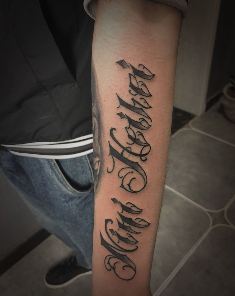 当前位置: 首页 >甘肃省天水市纹身店-天水新刺客纹身纹身图案>精美小图纹身图片_手臂Old School花体字纹身图案