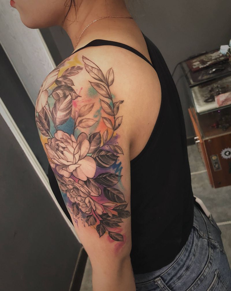 水彩纹身图片_手臂胸部点刺水彩纹身图案