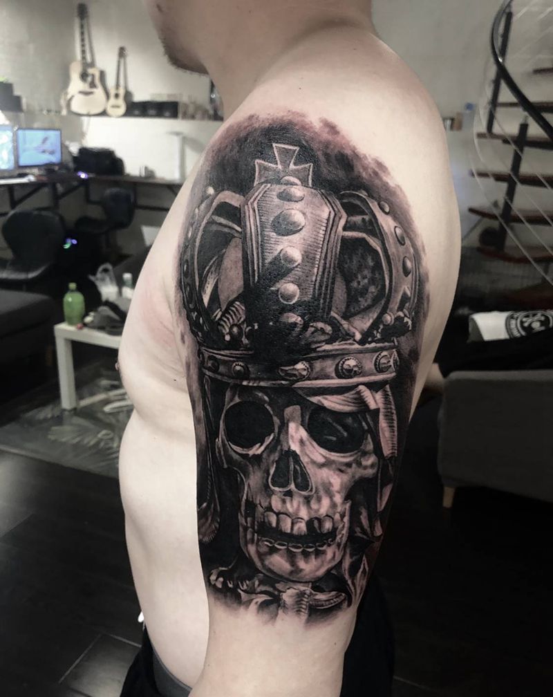 当前位置: 首页 >甘肃省兰州市纹身店-兰州葉雕青艺术工作室纹身图案>国王纹身图片_手臂欧美写实皇冠骷髅国王纹身图案