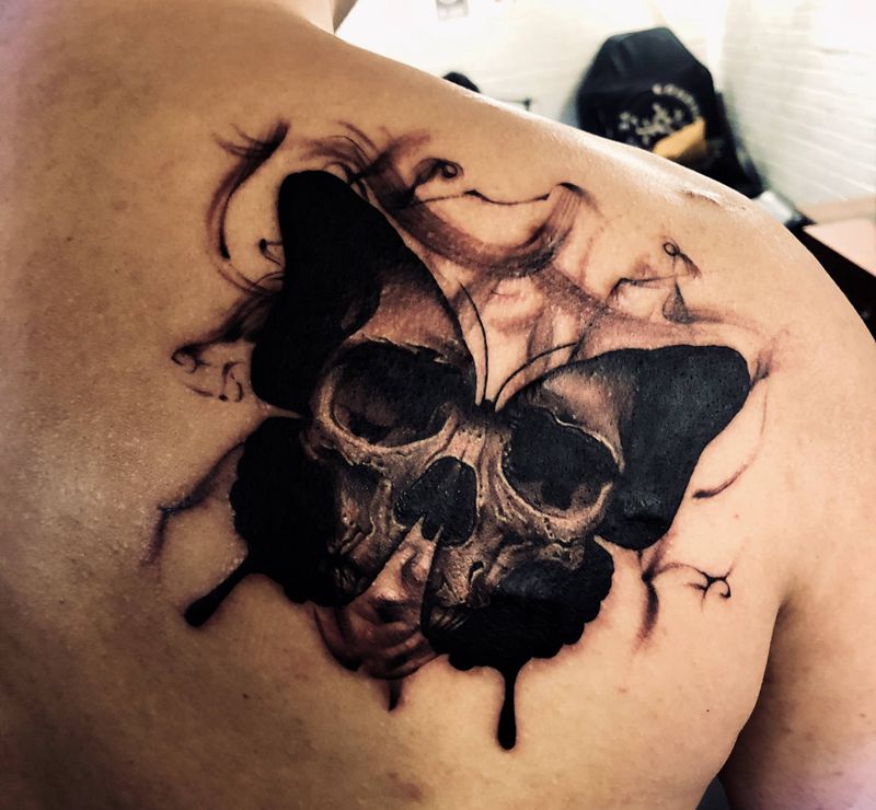 当前位置: 首页 >甘肃省兰州市纹身店-兰州葉雕青艺术工作室纹身图案>骷髅蝴蝶纹身图片_肩部欧美写实骷髅蝴蝶暗黑纹身图案