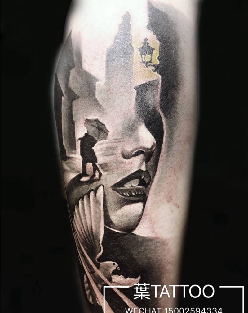 拥吻纹身图片_腿部欧美写实水墨鸽子接吻街景纹身图案