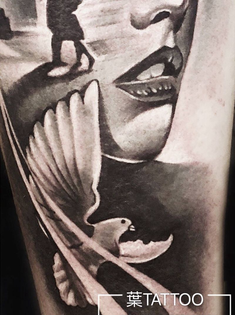 拥吻纹身图片_腿部欧美写实水墨鸽子接吻街景纹身图案
