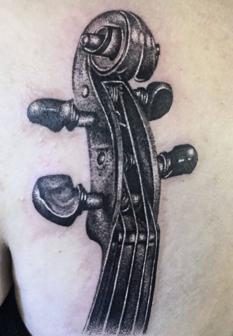 大提琴琴头纹身图片_肩部背部点刺欧美写实大提琴乐器音乐纹身图案