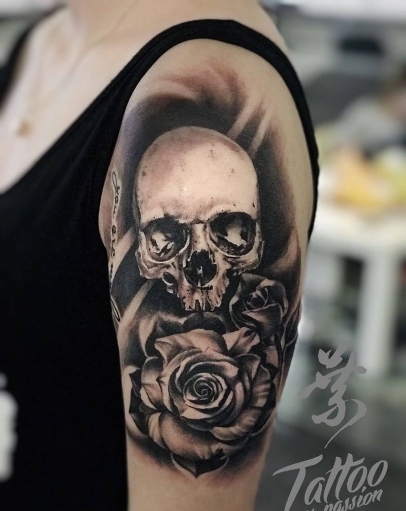 骷髅玫瑰纹身图片_手臂欧美写实骷髅玫瑰暗黑纹身图案