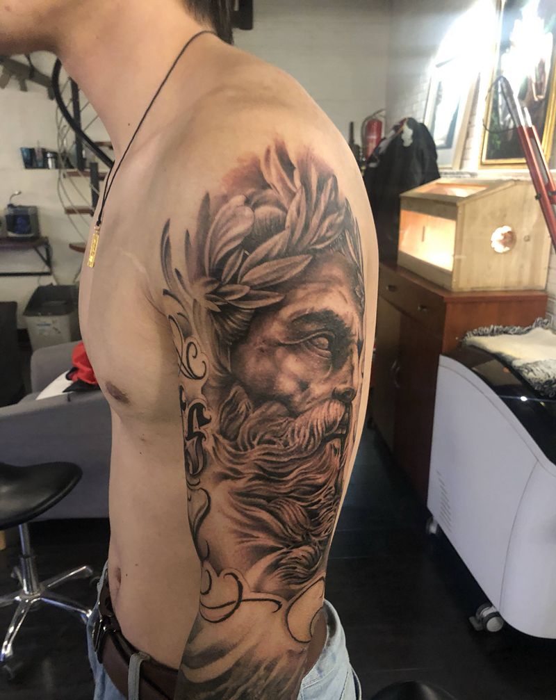 当前位置: 首页 >甘肃省兰州市纹身店-兰州葉雕青艺术工作室纹身图案>波塞冬纹身图片_手臂欧美写实波塞冬奇卡诺花体字纹身图案