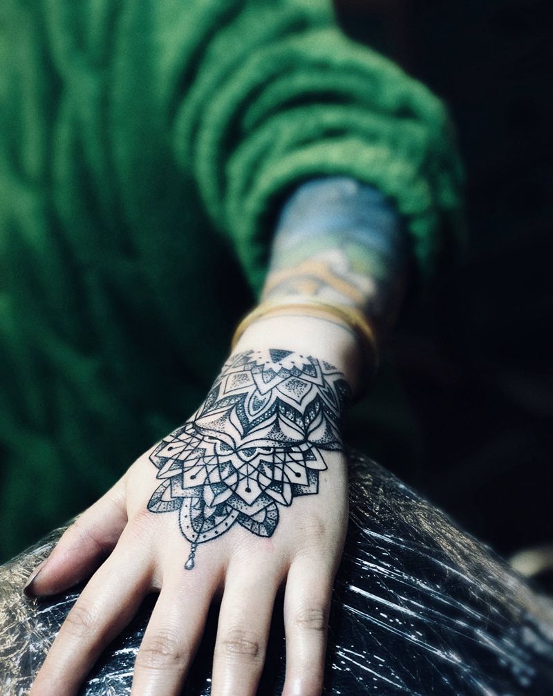 当前位置: 首页 >甘肃省兰州市纹身店-兰州葉雕青艺术工作室纹身图案>繁花纹身图片_手部点刺几何繁花曼陀罗手背纹身图案