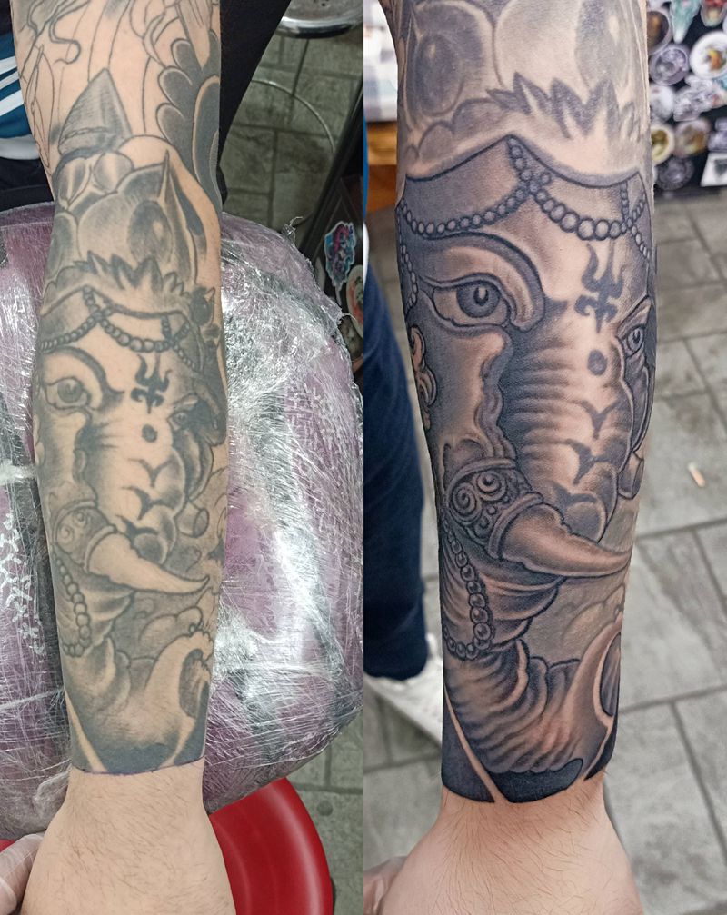 当前位置: 首页 >甘肃省天水市纹身店-针艺轩纹身纹身图案>象神修改纹身图片_手臂纹身图案