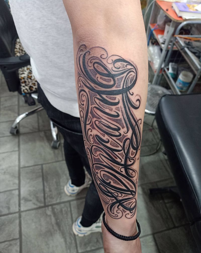 当前位置: 首页 >甘肃省天水市纹身店-针艺轩纹身纹身图案>花体字纹身图片_手臂花体字纹身图案
