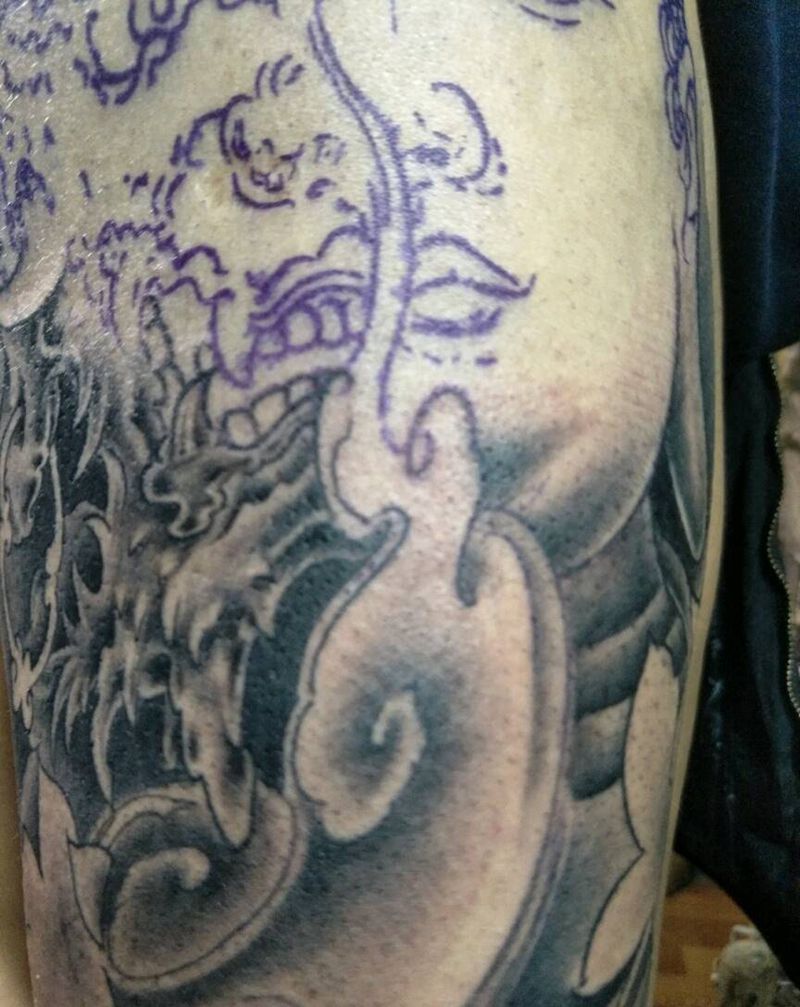 • T网红王老大花腿龙纹身图片_腿部新传统纹身图案
