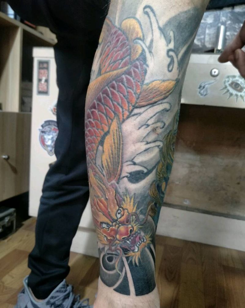 • T网红王老大花腿龙纹身图片_腿部新传统纹身图案