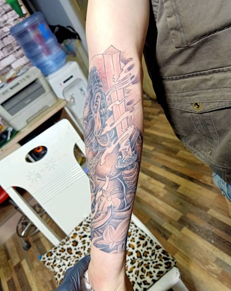 当前位置: 首页 >甘肃省天水市纹身店-针艺轩纹身纹身图案>不动明王遮盖纹身图片_手臂纹身图案