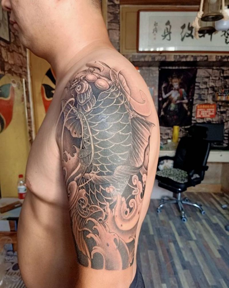 鲤鱼遮盖纹身图片_大臂纹身图案