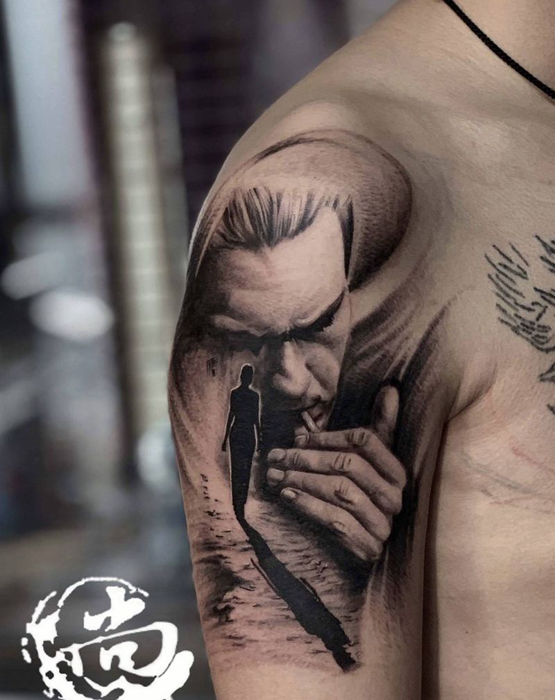 抽烟的男子纹身图片_肩部手臂欧美写实纹身图案